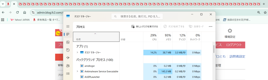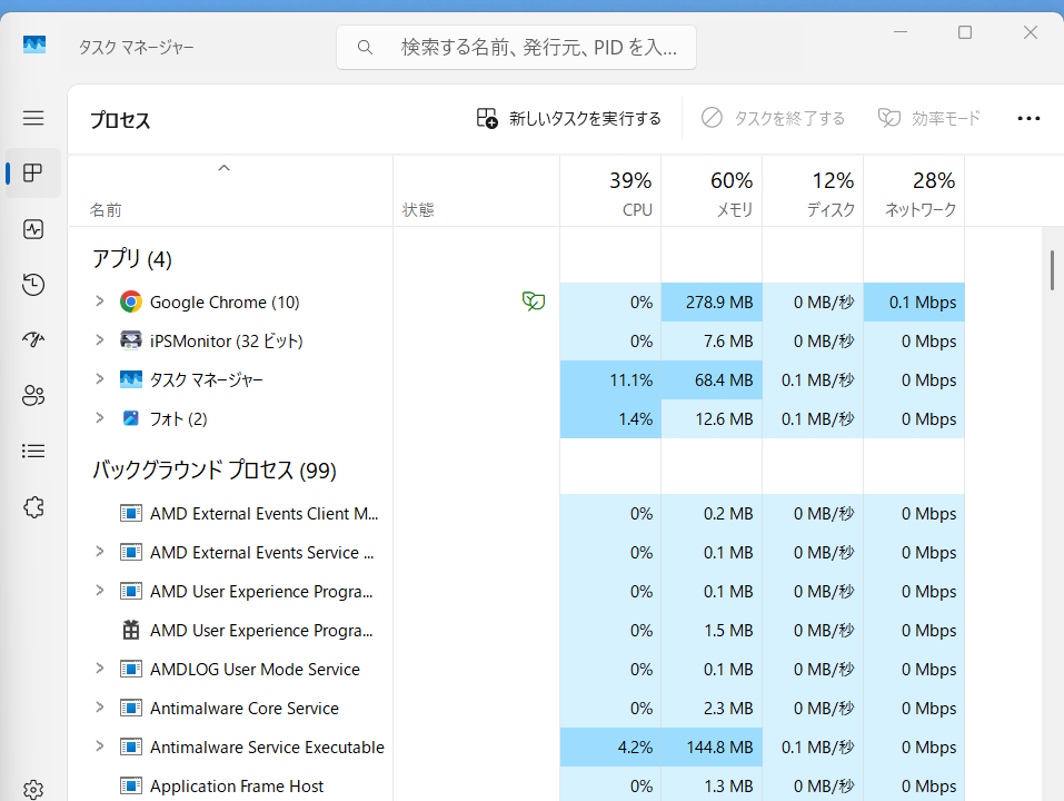グーグルChromeとタスクマネージャーを起動していてもメモリーは60%です